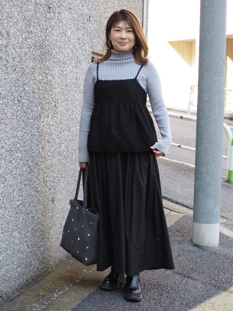 黒をベースにまとめたモノトーンコーディネート。おしゃれ見えのコツは素材感にあり。マットな質感のスカートに対し、ビスチェはシャギー素材、異素材を組み合わせることで、同じ黒同士でも立体感が生まれます。