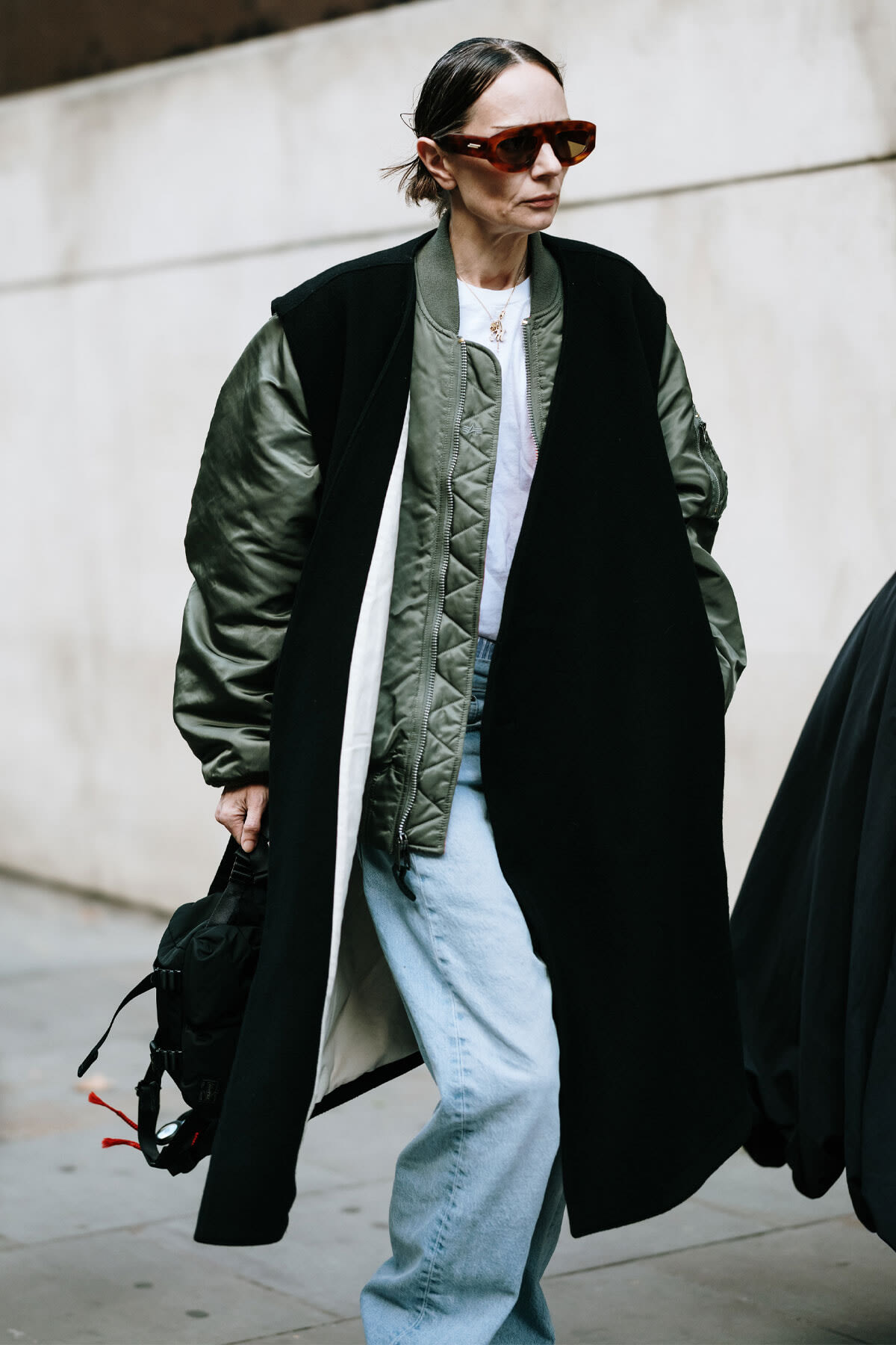 次はミラノのストリートを闊歩していたカリーヌ・ロワトフェルド。こちらもボンバージャケットを羽織っているが、袖がかなり太くデザインされていて肩を落として着ている。そして、ダメージデニムのスカートは超タイトを選択。デニムの足元をパンプスにしてバランスを取る手法はよくあるが、着方やシルエットで自らのセンシュアルな世界観に取り込んでいるのがさすが。